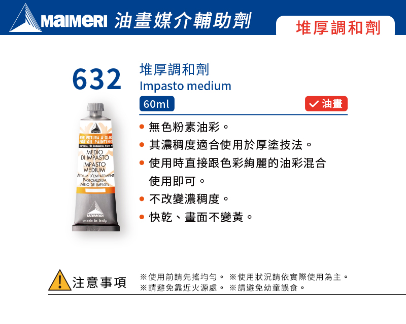 商品說明: 無色粉素油彩,其濃稠度適合使用於厚塗技法。 使用時直接跟油彩混合使用即可。 調和顏料時不會改變顏料濃度,可增加使用次數,加以節省材料成本。 能使筆觸厚實,讓畫面豐富有張力。 乾燥速度快,畫面乾燥後不變黃。