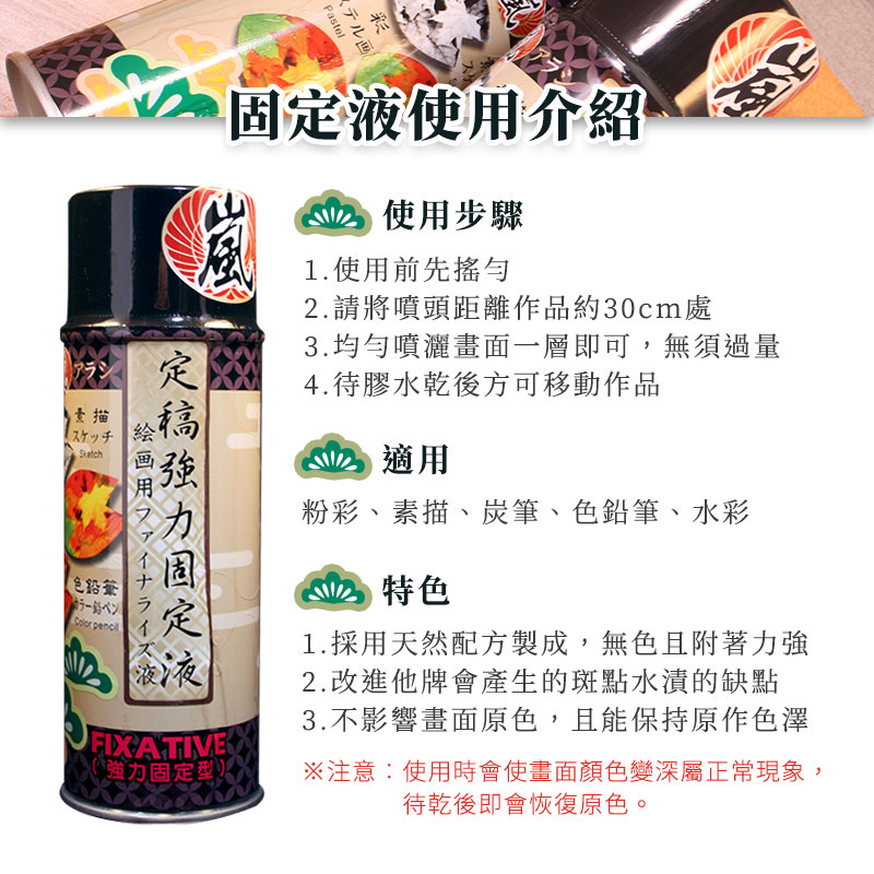 商品說明: 採用高級原料製成之無色噴膠,附著力強 。 使用後畫面不會產生斑點 。 使用後可進行補充或修改二次上色 。 水性噴膠,噴後較深色全乾後可回復原來作品原色 。 獨特天然配方,噴出味道芳香 。