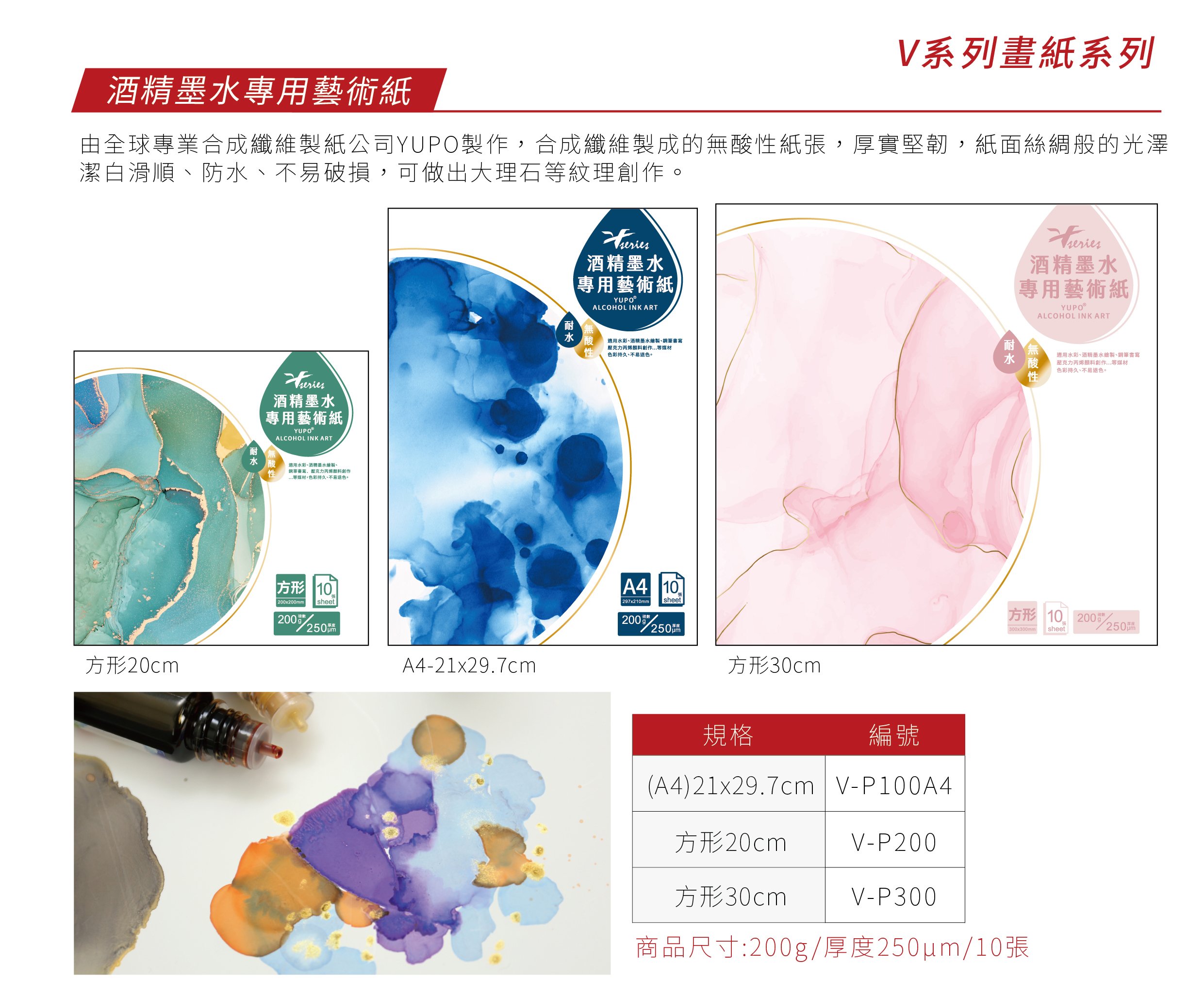 商品說明: 酒精墨水流動畫專用,可做出大理石等紋理創作。 適用於酒精墨水、水彩、鋼筆書寫、壓克力顏料、油性代針筆等多種媒材。 合成纖維製成的無酸性紙張,厚實堅韌,保存良好情況下不易褪色。 紙面絲綢般的光澤,潔白滑順、防水、不易破損。 由全球專業合成纖維製紙公司YUPO製作,品質保證。 ½