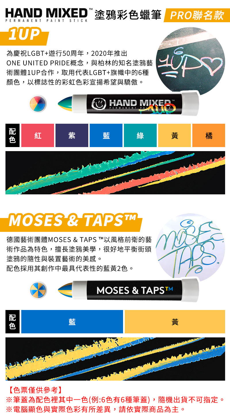 商品說明: 日本Sakura Colors製造,並在西班牙巴塞隆納進行手工加工。 柔滑的質地及超耐久的實心顏料棒,易於使用及攜帶。 覆蓋力好、具有防水性及有較強的耐光性、耐熱性。 適用於所有天氣條件下繪製;使用溫度範圍(-10~200°C)。 適用於所有材質的表面作畫,如陶瓷、布、紙/板、玻璃、塑膠、鋼鐵、木頭等。 可用酒精或稀釋劑去除。 兩種大小:一般款(70色)、Pro Fat King巨形款(10色)。 ※同配色系會有不同筆蓋顏色,隨機出貨不挑選!!! ※請放置於陰涼處,避免靠近火源!! ※產品具有濃厚氣味,需在通風良好場所使用。
