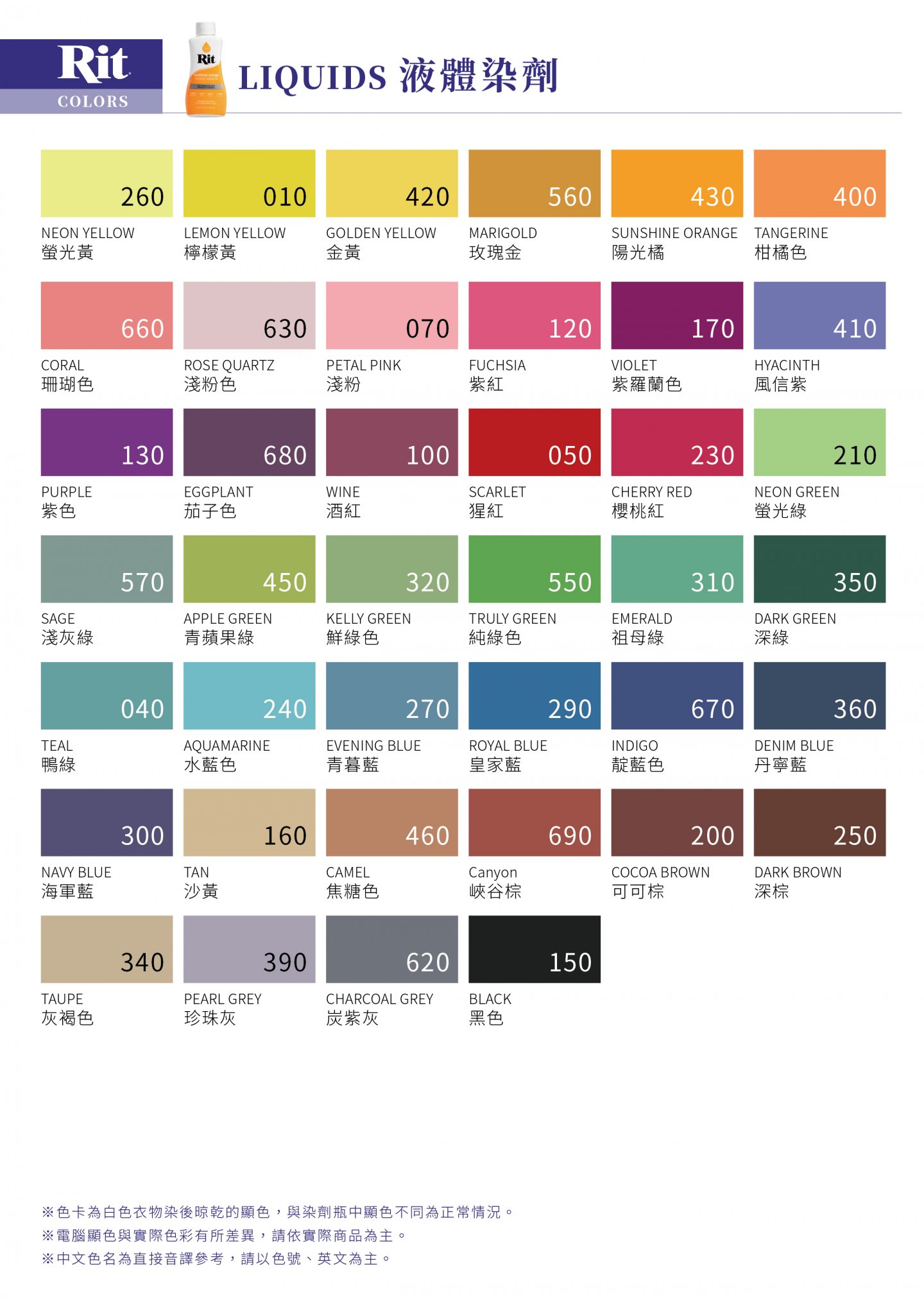 ※有色布料建議預先使用去色劑,如直接進行染色,呈現顏色會與染劑顏色有誤差!!!
