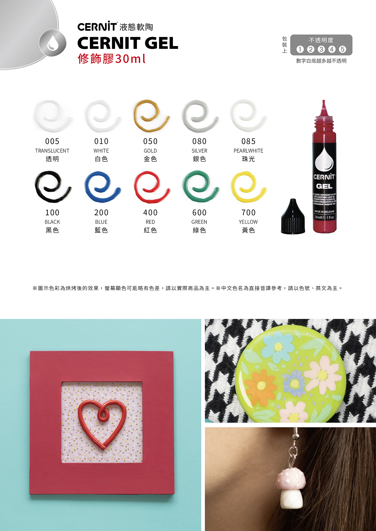 - 使用傳統控溫烤箱烘烤即可定型。※烤箱溫度設定約110~130°C,最長30分鐘(依作品大小及厚度做調整)。