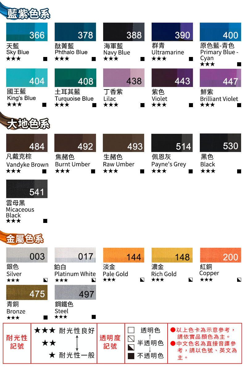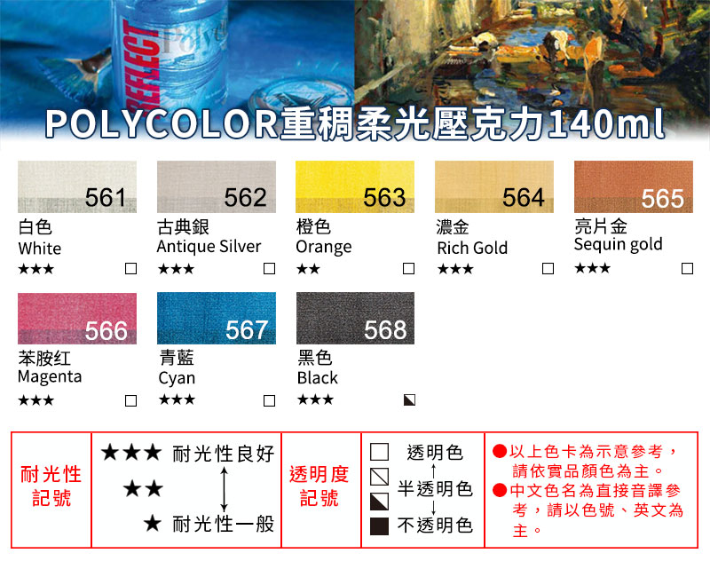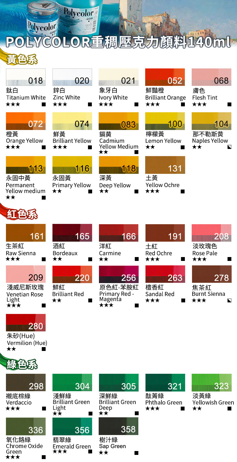 商品說明: 顏料色彩鮮艷明亮、飽和度高、附著力強。 耐光度佳,不易因光照而褪色。 乾燥後會形成堅固、耐久且有彈性的膜,暴露在空氣中也能保持良好。 適用於各種媒材,例玻璃、瓷器、紡織品、金屬等。 適用於大型表面,佈景、海報、畫布繪畫、室內裝飾和外牆繪畫。 POLYCOLOR重稠壓克力有基礎色系、柔光色系 。