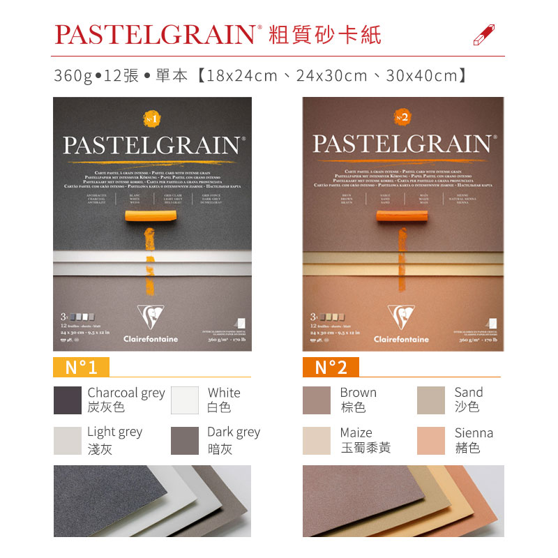 商品說明: ✦Pastelgrain 粗質砂卡紙 無酸性紙的特性,讓紙張不易長期暴露在空氣和陽光之中而發生變質。 比PASTELMAT系列顆粒更粗糙,適合抽象或具象化的繪畫風格。 色粉固著力佳,可多層次上色。 使用筆刷工具或指腹輕輕推開色粉就能讓畫面鋪色達到均勻的效果。 適合粉質、可溶於水的乾性媒材繪製(如:炭筆、炭精筆、水性色鉛筆、液態炭筆膏)。 每頁均附一張描圖紙可保護畫面,色粉不會沾黏弄髒,可省去噴保護膠的步驟。