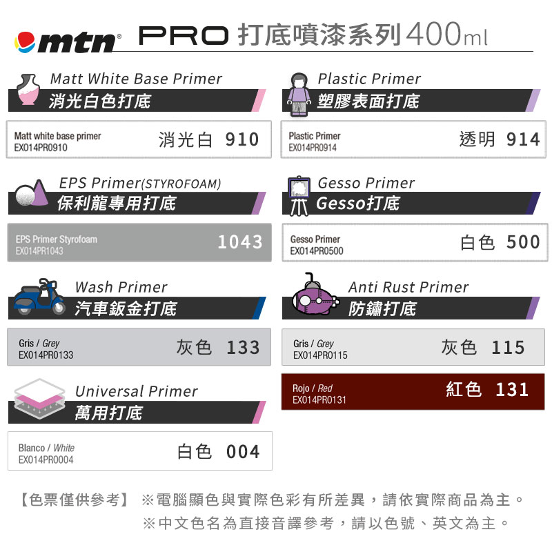 商品說明: 表面帶有光亮搪瓷質感的白色打底漆。 可作為打底漆或最終保護塗層。 任何表面上都有強大的附著力。 可噴塗於塑膠(PVC、壓克力)、金屬(鐵、鋅、銅)、玻璃、陶瓷、磁磚等材質。 耐熱100℃,室內外皆可使用。 完全乾燥後可搭配MTN彩色噴漆上色。 ※建議提前小範圍測試,確保材質與噴漆效果相容。 ※使用前請將電源關閉,並在通風處使用、戴上面罩防止吸入成分。 ※使用前請先搖均勻。請放置於陰涼處,避免靠近火源!! ※使用完後須將噴嘴擦拭乾淨,避免噴嘴口堵塞。