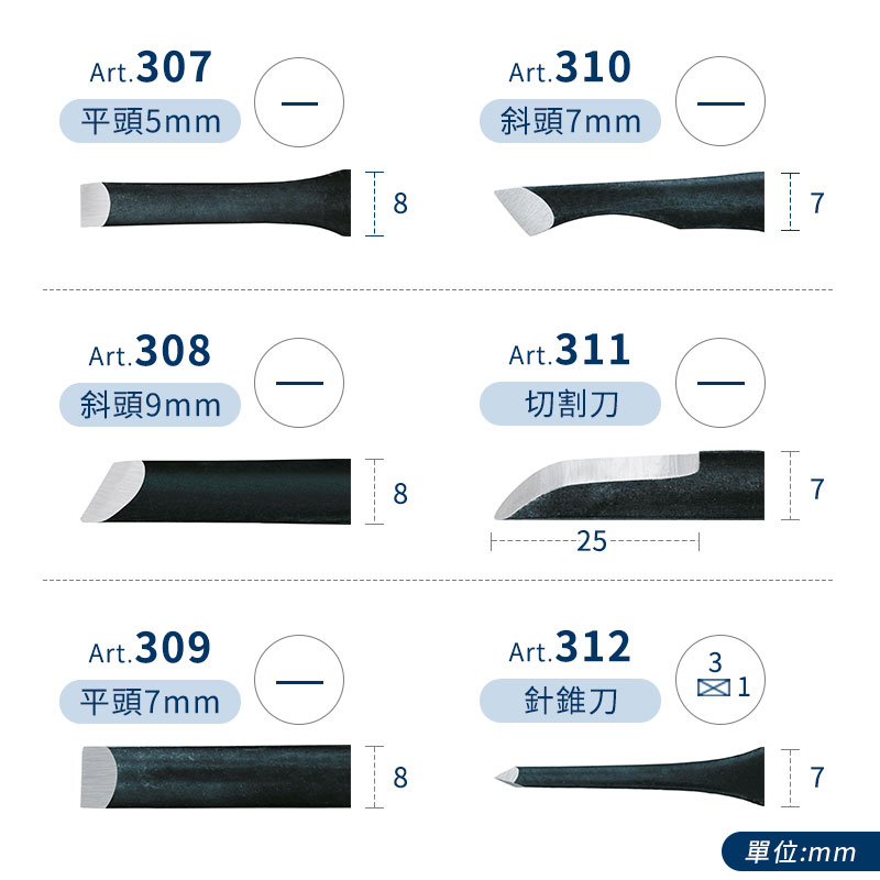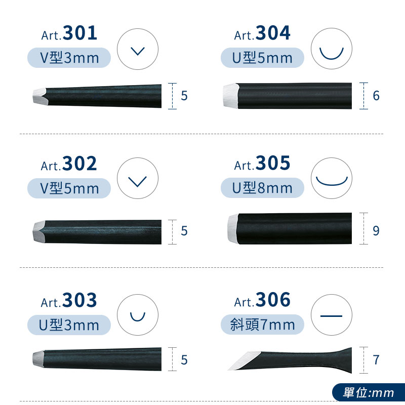 商品說明: 基礎刀型齊全:平刀、V刀、U刀,滿足初階雕刻需求。 適用多種材質雕刻:軟木板、橡皮擦、軟質版材等。 握柄採用醋酸纖維素製作,耐用輕巧、圓潤好握,比一般塑膠更耐油與弱溶劑。 硬化鋼刀片硬度高、耐磨穩定,不易變形,適合需要鋒利或抗磨耗的用途。 需存放於乾燥環境,抗腐蝕性較弱,請避免潮濕。