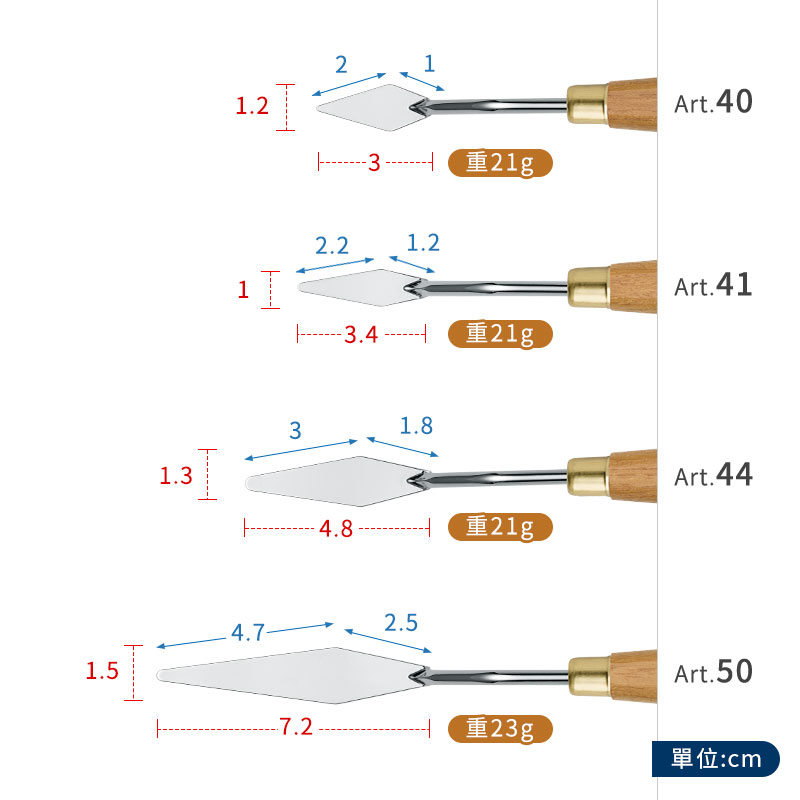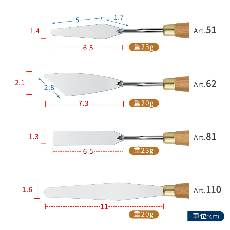 商品說明: 【用途】厚塗、均勻鋪色 【適合】初學者到專業創作者 60°刀柄與刀片角度設計,更貼合畫布表面。 適合厚塗表現與大面積均勻鋪色。 經典造型刀片,柔韌有彈性,操控靈活,耐用且抗腐蝕。 天然相思木手柄,色澤溫潤,展現經典復古風格,兼具美感與實用性。 ※因生產批次不同,每一支木柄上的紋路、顏色也不相同。