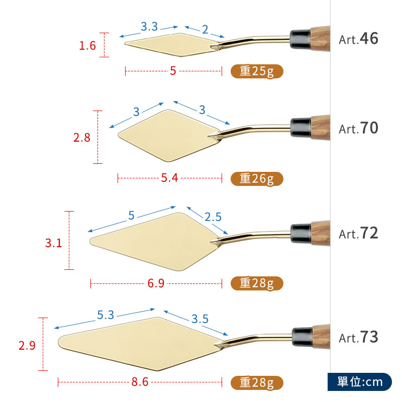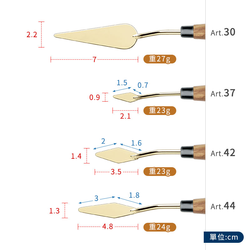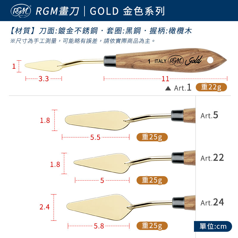 商品說明: 【用途】顏料塗抹、肌理製作、質感送禮或展示 【適合】喜愛奢華質感、送禮或收藏 鍍金不銹鋼刀片,堅韌耐用,質感高貴典雅。 天然橄欖木手柄,紋理細緻獨特,握感舒適厚實。 實用工具與藝術收藏兼具,適合專業創作與質感送禮。 ※因生產批次不同,每一支木柄上的紋路、顏色也不相同。