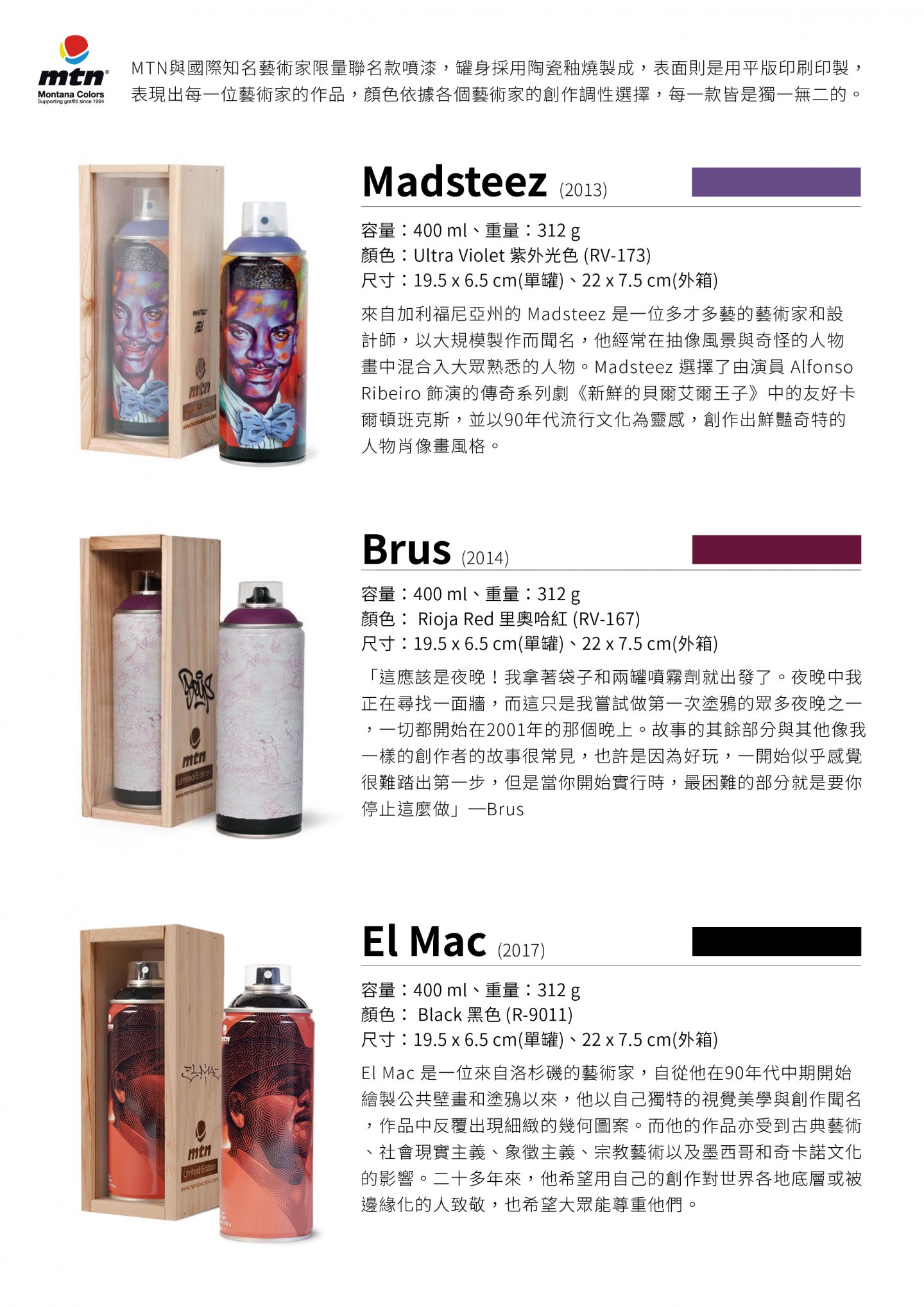 商品說明: 與國際知名塗鴉藝術家合作,全球限量500套,極具收藏價值! 罐身以陶瓷釉燒製成,罐身上則以平版印刷印製每位藝術家的作品。 高壓好操控,容易重複塗抹,能快速乾燥且有十分出色的覆蓋力,乾燥後能保持顏料的光澤度與顏色呈現。 完全乾燥時間約1日,一旦乾燥後薄膜聚合,就具有很強的抗刮擦性。 可以很好的抵抗陽光、雨水及紫外線。 能使用於各種材質及用途,如:藝術、工藝品、工業製造...等。