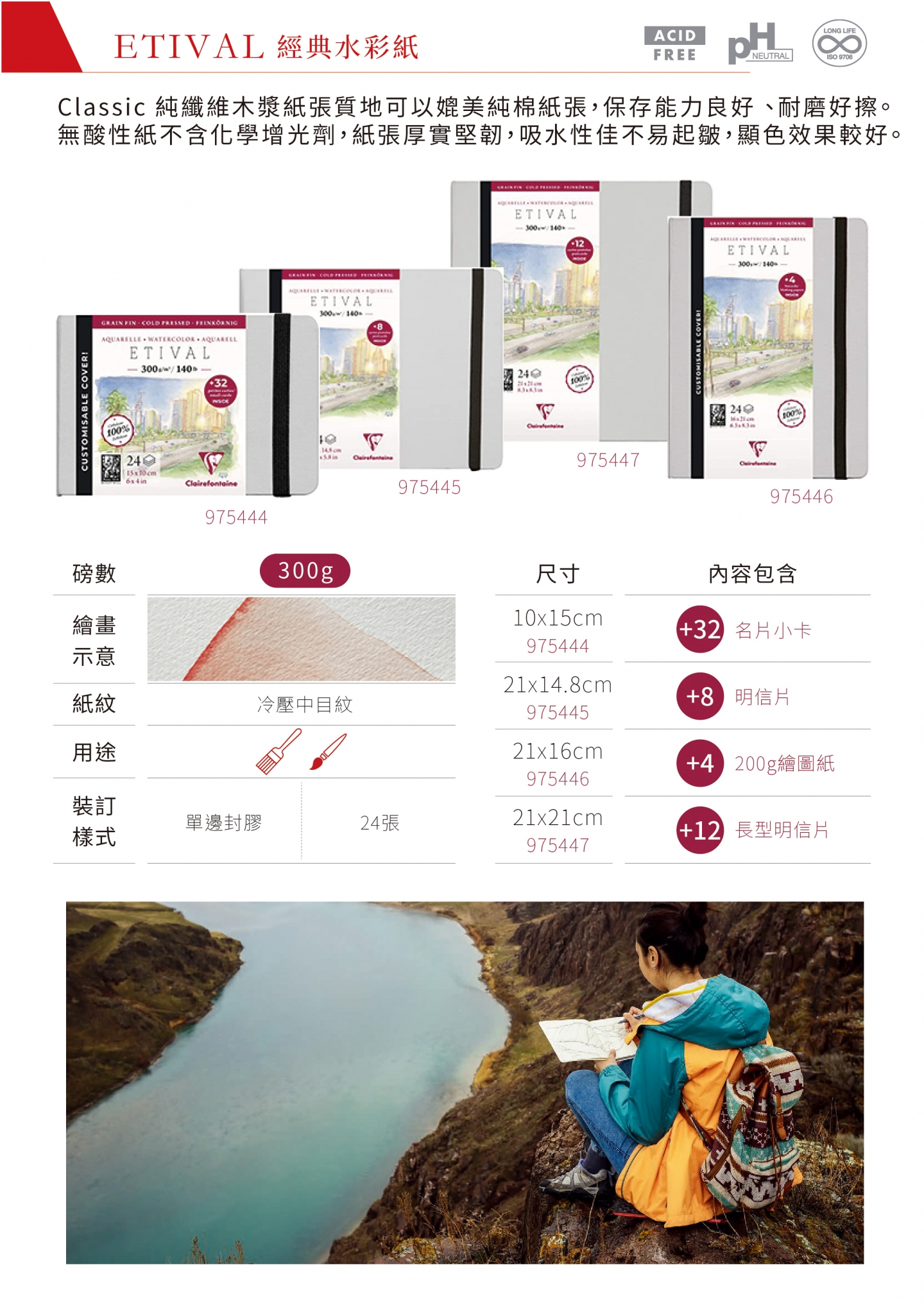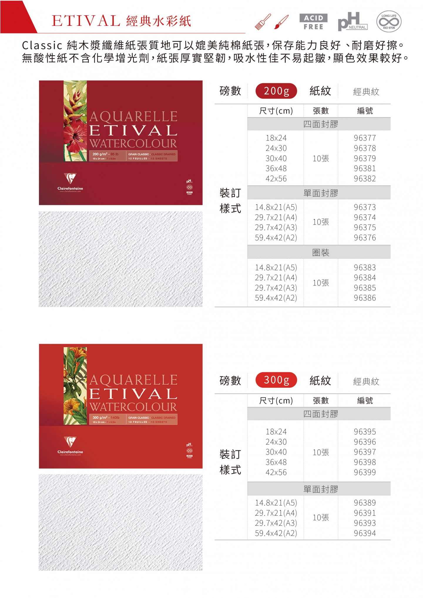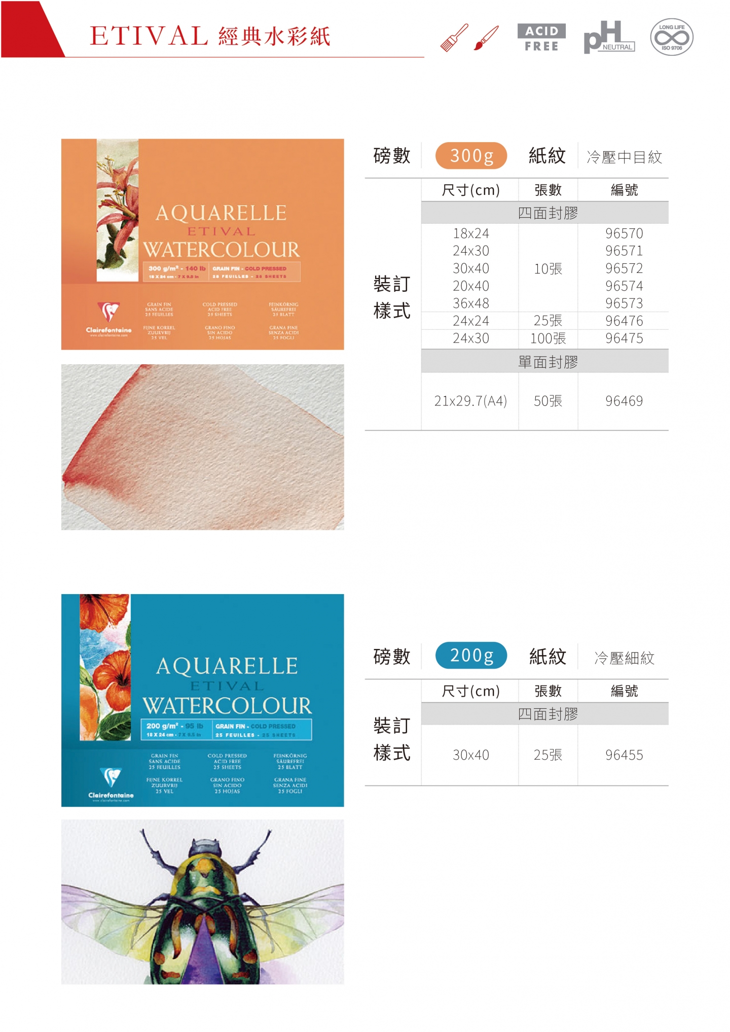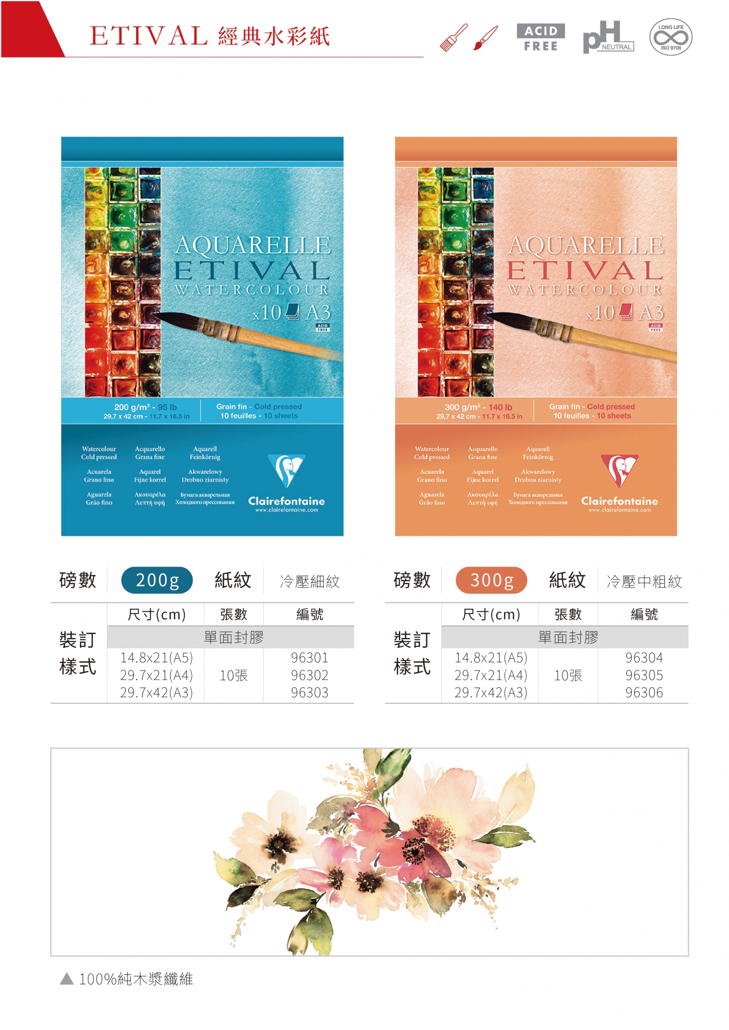 - 亮紅(熱帶花)/經典紋:兩款經典紋是克萊爾方丹新創造的特別紋理,以提升Etival系列水彩紙,適合各種水彩技法繪製。