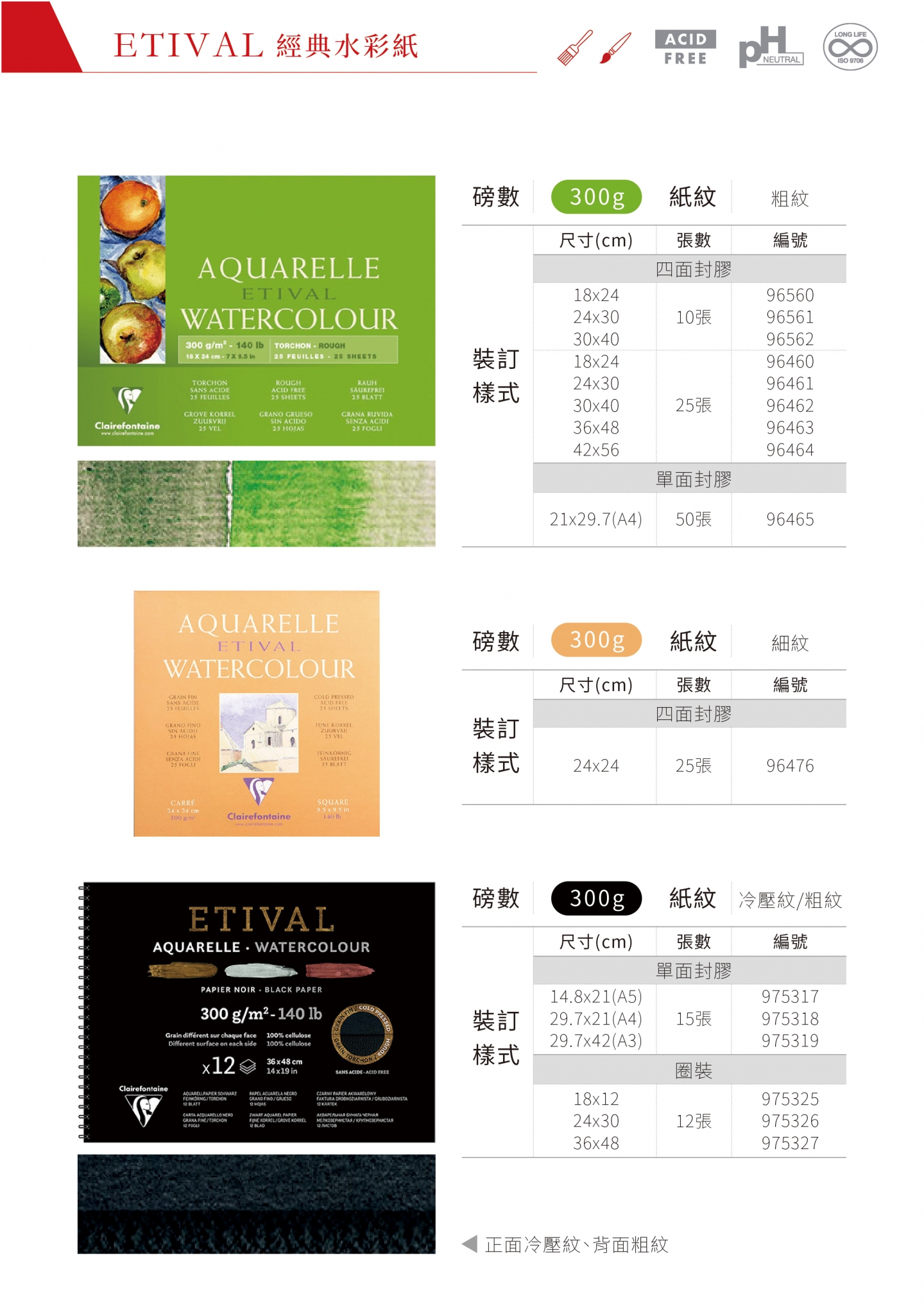 - 深紅(紅花)/經典紋:兩款經典紋是克萊爾方丹新創造的特別紋理,以提升Etival系列水彩紙,適合各種水彩技法繪製。